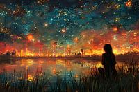 Dit levendige kunstwerk vangt de essentie van een bruisende stad, badend in het licht van duizenden lichten die weerspiegelen in het kalme water. Het gebruik van felle kleuren zoals rood, oranje en geel creëert een warm en uitnodigend gevoel, terwijl de donkere silhouetten van de stad en de donkerblauwe nachtelijke hemel een krachtig contrast bieden. Dit stuk nodigt de toeschouwer uit om na te denken over de harmonie tussen natuur en stedelijke pracht, een getuigenis van de levendigheid en eeuwige beweging van het stadsleven.