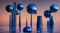Dit stuk weerspiegelt een harmonie van geometrie en reflectie. De zorgvuldig uitgebalanceerde composities van cilinders en bollen, die oprijzen uit en zweven boven een digitaal raster, creëren een gevoel van orde binnen de grenzen van het surreële. Deze elementen, glanzend en glad, vangen de omgeving op een manier die de kijker zowel…