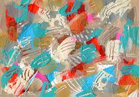 Abstract kunstwerk. Schilderij in combinatie met collage technieken. Inspiratie: gedachten die passeren als losse flarden. Structuur met veel lagen, kleuren en textuur.