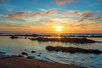 Een betoverende kustlijn waar de zon haar warme gouden stralen over het water en de rotsen laat dansen. Deze foto vangt de serene schoonheid van de natuur, perfect voor wie een inspirerende en natuurlijke sfeer in huis wil brengen.