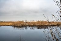 Prachtige landschapsfoto van een stukje Nieuwkoops plassen, De wat grijze luchten en het goudgele riet dat reflecteert in het blauw-grijze water.
