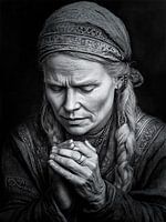 Een serene oudere vrouw is vastgelegd in diepe overpeinzing, haar handen in gebed geklemd. De ingewikkelde details van haar gevlochten haar en traditionele kleding onthullen een rijk cultureel erfgoed. Zacht licht accentueert de lijnen in haar gezicht en verbeeldt wijsheid en veerkracht. Haar uitdrukking belichaamt een mix van hoop en rust, wat een diepe verbondenheid met haar gedachten en geloof suggereert.