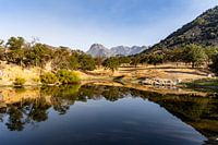 Dit serene landschap, gelegen aan de voet van het Sequoia National Forest, biedt een vredig tafereel waarbij het heldere water de omliggende natuur perfect weerspiegelt. In de verte rijzen de bergtoppen op, een voorproefje van het ruige terrein dat kenmerkend is voor de Sierra Nevada. De stilte van de omgeving wordt weerspiegeld in de stille wateren, die de blauwe hemel en de goudgele tinten van de herfstvegetatie opnemen. Dichtbij vind je de imposante sequoiabomen, waarvoor het nabijgelegen nationale park beroemd is, en biedt de Kings Canyon met zijn diepe kloven een dramatisch contrast met deze vredige weide. Dit landschap, een knooppunt van verschillende ecosystemen, belichaamt de diversiteit van Californië's natuurschoon. Het is een prachtige illustratie van de rust die gevonden kan worden aan de rand van Amerika's wildernis, een adembenemende uitnodiging voor avonturiers en natuurliefhebbers. Deze foto zou niet alleen dienen als een visuele ontsnapping in elke ruimte maar ook als een herinnering aan de ongerepte schoonheid die op ons wacht buiten de drukte van de bewoonde wereld.