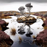 Dit schilderij verbeeldt een rustig, peinzend landschap in een drooggelegd moeras met een eenzame boom op een klein eiland omringd door ondiep water. Het gedempte kleurenpalet, gedomineerd door grijs-, bruin- en paarstinten, roept een gevoel van kalmte en verlatenheid op. Heide en grassen omzomen de waterkant en combineren natuurlijke…