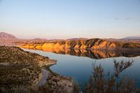 De reflectie van bergen in het stuwmeer Embalse de Negratin, Granada, Spanje.