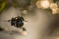 Na de natte winter waren veel paden ondergelopen in het park dat ik bezocht. In een van de plassen staken nog net wat bladeren boven het water uit. Ik vond het een mooi gezicht: De spiegeling van de bladeren, de mooie lichtval die een verstild effect aan het water gaf en de vrolijke hooglichten. Een beetje vrolijkheid op een sombere dag.