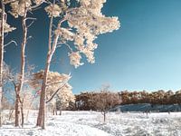 Het besneeuwde landschap van de Hatertse en Overasseltse vennen bij Nijmegen. Deze foto is gemaakt met een speciaal aangepaste camera. Deze camera registreet niet het gewone licht, maar alleen nog het licht in het Infrarood spectrum. Hierdoor is elke foto weer een verrassing, omdat je niet direct kan zien wat de camera waarneemt. Filters zorgen ervoor dat er gekozen kan worden welke golflengte van het infrarood licht wordt doorgelaten. Door later in de nabwerking het rode en blauwe kanaal om te wisselen wordt de foto omgezet naar een zogeheten "valse kleuren" foto. Het geeft een bepaalde sfeer aan een foto.