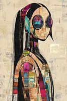 Reflective Mystery - Dit portret schilderij van een vrouw is uitgevoerd in een moderne, collage-achtige stijl met een krachtig gebruik van kleur en textuur, en bevat een opvallende bril met reflecterend glas.