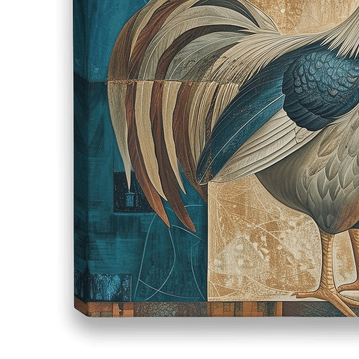 Regal Roost Rulers - Dit haan schilderij presenteert twee majestueuze hanen staand voor een geabstraheerde achtergrond die elementen van zowel geometrische als organische vormen bevat. De linker haan, prominent in een zijprofiel, toont een prachtige mix van witte en grijze veren, met een opvallend geschakeerde blauwe en bruine staart.…