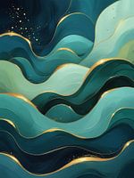 Dit prachtige abstracte kunstwerk vangt de serene maar krachtige essentie van oceaangolven, weergegeven in een verfijnd palet van diep groenblauw, kalmerend aquamarijn en weelderig smaragdgroen. Elke vloeiende curve is subtiel omlijnd met glinsterend goud, waardoor een luxueus en weelderig gevoel ontstaat. Kleine gouden spikkels drijven over de donkere tinten en doen denken aan verre sterren of bruisende zeestralen en voegen een vleugje etherische magie toe. De gelaagde, golvende vormen roepen een gevoel van voortdurende beweging en diepte op en nodigen de kijker uit in een rustige, dromerige waterwereld. Perfect om een vleugje moderne elegantie en een vleugje rustgevende kleur toe te voegen aan een moderne woonruimte, kantoor of slaapkamer.