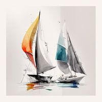 Het abstracte schilderij "Regatta" toont een scène van een zeilwedstrijd in kleurrijke, dynamische penseelstreken. De zeilboten zijn gestileerd en in verschillende maten en vormen weergegeven, waardoor een zekere abstractie en beweging ontstaat. De felle kleuren en energieke lijnen suggereren snelheid en de competitieve geest van de zeilers. De compositie dompelt de kijker onder in de wereld van het zeilen en laat hem de vrijheid en vreugde voelen die deze sport met zich meebrengt. Over het geheel genomen is "Regatta" een levendig en krachtig schilderij dat de geest verlevendigt en de verbeelding prikkelt.