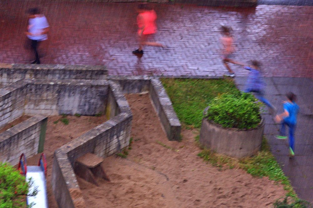 Kinderen op de vlucht voor een regenbui