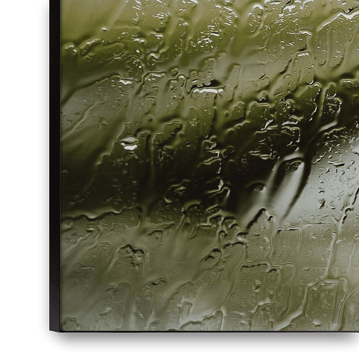 De foto heeft een melancholische en dromerige sfeer. De regendruppels op de ruit vervormen het landschap, waardoor de beelden abstract en schilderachtig aanvoelen. Het lijkt alsof je door een waas van herinneringen naar de wereld buiten kijkt—een mix…