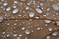 Regen druppels op een gevallen eiken blad. Naast de druppels zijn ook de nerven en de structuur van het blad goed te zien.