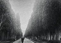 Een regenachtige dag in Toscane. Een vrouw loopt alleen met paraplu in de hand op de cipressenlaan van Bolgheri in Toscane. Straatfotografie uit Italië in zwart-wit.