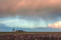 Een verlaten boerderij in het Groningse Landschap met daar boven een fikse regenbui.