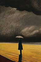 Een man trotseert de regen die uit donkere wolken valt. Het is guur weer en de man is er op gekleed. Het is koud en nat en niet leuk om buiten te zijn, maar de regen is goed voor ons. Het geeft de natuur het water dat ze nodig heeft om te overleven. Water is goud.