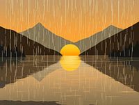 Een serene illustratie van een zonsondergang boven een rustig meer, omlijst door bergen, tijdens een zachte regen. De warme tinten van de ondergaande zon contrasteren met de koele regen, waardoor een vredige en rustige sfeer ontstaat. De reflectie van de zon op het water voegt diepte en schoonheid toe aan de scène.