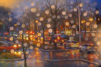 Dit schilderij verbeeldt een regenachtige avond in de stad, gezien door een met regendruppels bedekt raam. Het natte asfalt weerspiegelt de warme gloed van autolichten, straatverlichting en verkeerslichten, waardoor een kleurrijk en bijna dromerig stadslandschap ontstaat. De combinatie van koele blauwtinten in de lucht en warme geel- en…