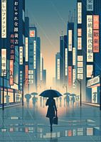 Tokio was de inspiratie om dit stuk te maken: De charme van Tokio's Shinjuku-district, Japan, waar regenachtige straten tot leven komen met paraplu's en reflecterende billboards. Het nostalgische kleurenpalet dat ik voor deze illustratie heb gekozen, roept een vervlogen tijdperk op. De Japanse karakters op de billboards bevatten echte woorden zoals 'restaurant' en 'boekwinkel'.