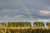 Ein Regenbogen über einer Baumallee in Ostfriesland.