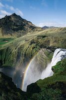 Een natuurlijk kleurenspektakel bij de Skógafoss-waterval. Zonlicht breekt door de nevel en onthult een heldere regenboog boven het ruige IJslandse landschap.