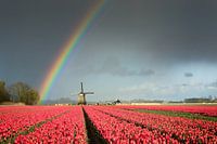 Een mooie regenboog tijdens een voorjaarsstorm boven een molen en een bollenveld met rode tulpen in een oud-Hollands landschap in the Bollenstreek in Nederland.