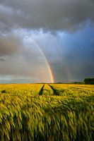 Ik had de perfecte avond uitgekozen om foto's te gaan maken. Gouden korenvelden, donkere onweerswolken als een achtergrond en een dubbele regenboog. Veel beter kan je het niet hebben!