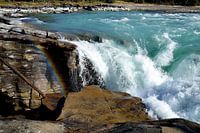 Omdat ik dol ben op watervallen moesten we gewoon stoppen bij de Athabasca Falls langs de Icefields Parkway in Alberta, Canada. Omdat de zon volop scheen hadden we het voorrecht om een paar mooie regenbooguitzichten te krijgen.