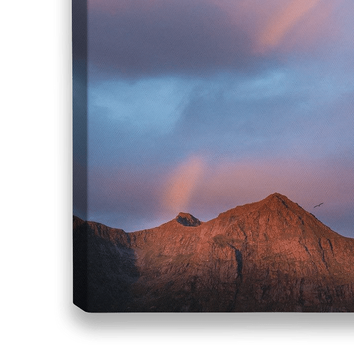 Mooie zonsondergang met regenboog boven de bergen in de Lofoten, Noorwegen. Donkere wolken volgen de zon op. Stilleven in mooie pastelkleuren. Hang jij deze mooie foto print aan jouw muur?