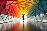 Model met een regenboog paraplu op een prachtige brug. Deze afbeelding is eruit gekomen en ik ben er helemaal weg van.