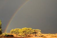 Alle kleuren van de regenboog tijdens een regenbui met een onheilspellend uitziende lucht met het laatste zonlicht van de dag, tegen een donkere lucht in Namibië. Zen, rust