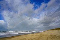 Regenboog op het strand van Texel in de Waddenzee op het Noordzee strand tijdens een stormachtige herfstochtend met zand dat over het strand waait.