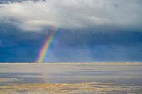 Regenboog op het strand van het eiland Texel in het Waddenzeegebied in het noorden van Nederland tijdens een stormachtige herfstochtend.