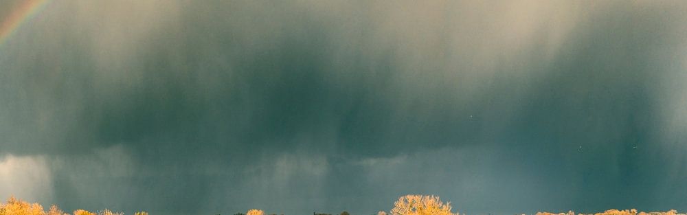 Regenboog tijdens een herfstbui over uiterwaarden van de IJssel bij Zwolle in Overijssel, Nederland. Het riet en de bomen op de voorgrond zijn helder verlicht terwijl de lucht op de achtergrond donker is.