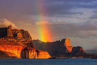 Na een dag met regen opende de bewolking zich tegen zonsondergang en presenteerde een prachtige regenboog over de Padre Bay, gelegen op Lake Powell in Glen Canyon National Recreation Area op de grens tussen Utah en Arizona in het zuidwesten van de Verenigde Staten.