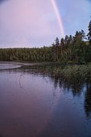 Een regenboog strekt zich uit over een Zweeds meer in Smaland. Beeld uit de Scandinavische natuur.