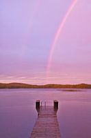 Een regenboog strekt zich uit over een Zweeds meer in Smaland. Beeld uit de Scandinavische natuur.