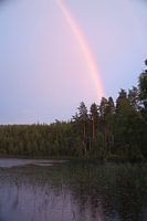 Een regenboog strekt zich uit over een Zweeds meer in Smaland. Beeld uit de Scandinavische natuur.