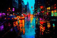Een gloeiende caleidoscoop van neonkleuren wordt weerspiegeld in de plassen van een straat vol regen. De glinsterende lichten van de winkels en de oplichtende verkeerslichten dansen in de nachtelijke jungle van de stad. Taxi's glijden majestueus voorbij, terwijl de sfeer gevuld is met pulserend leven en stedelijke magie. Een moment gevangen in schitterend licht en kleur.