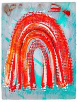 Een abstract en modern Mid Eeuw Modern schilderij in moderne Scandinavische stijl (Modern Scandi). Een expressieve abstractie met geometrische vormen en blokdrukelementen.
