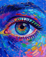 Ein Bild zeigt ein Auge, das in allen Farben des Spektrums erstrahlt und den Betrachter sofort in seinen Bann zieht. Die Iris ist keinheitlich, sondern ein lebendiges Mosaik aus kräftigem Rot, tiefem Blau, leuchtendem Gelb, sattem Grün, warmem Orange und zarten Violetttönen, die ineinander übergehen wie flüssige Aquarelle. Feinste…