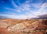 Bergweg door de bergen in de kleuren van de regenboog in China. Prachtige bergen tussen de gobi woestijn en de himalaya. Zhangye Danxia nationaal geologisch park.