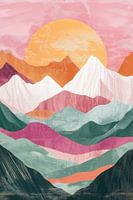 Een surrealistische berglandschap in levendige, contrasterende kleuren, met een grote oranje zon die opkomt boven gelaagde bergen in pastelkleuren, wat een dromerige en serene sfeer creëert.