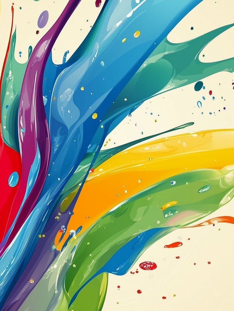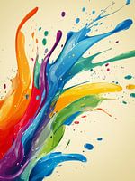 Dit levendige kunstwerk toont een mix van heldere regenboogkleuren zoals rood, blauw, geel en groen, die in spetters en lijnen zijn verdeeld op een lichte achtergrond. De kleuren zien er dynamisch uit en lijken in alle richtingen te stromen, waardoor de afbeelding een speelse en energieke vibe krijgt. Perfect voor creatieve ruimtes die gevuld moeten worden met kleur en levendigheid.