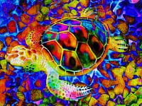 Een jonge schildpad pauzeert op de rotsen en kijkt uit naar de kust en de vrijheid en veiligheid van de golven. De regenboogkleuren die ik heb gebruikt, vooral op het schild, maken dit tot een levendig en kleurrijk stuk dat elke muur zal opfleuren, echt een regenboogschildpad.