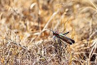 Prachtige macro opname van een Regenboogsprinkhaan in het hoge dorre gras in nationaal park Isalo in Madagaskar