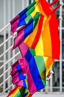 Tien regenboogvlaggen, wereldwijd symbool van de lgbti-beweging, wapperen in de wind tegen een stedelijke achtergrond. De foto is gemaakt tijdens de Rotterdam pride week.