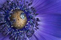 Anemonen heb je in verschillende kleuren. Ik vond deze diep paarse kleur bijzonder aantrekkelijk. Met deze macro opname zie je de schoonheid van de meeldraden extra goed. De regendruppel geeft extra glans aan de compositie