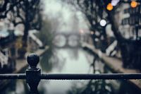 Regendruppels op de reling van de Weesbrug in Utrecht ovder de Oudegracht. 12 december 2020, kort voor de sluiting van de winkels vanwege de lockdown i.v.m. covid liep ik naar mijn fiets op de brug om naar huis te gaan. De somberte in de foto sluit uitstekend aan bij de realiteit van dat moment.